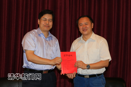 图为何福胜代表民盟清华大学委员会向校图书馆捐赠《清华盟讯》。孟新民 摄