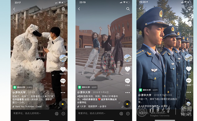 以清华大学抖音账号为例,2019年先后制作出多部播放量超1000万、点赞数过100万的叫好又叫座的“爆款”作品,如“开学典礼佩戴徽章仪式”“天机‘芯’自行车”“清华大学,这里有无限可能”“88岁老党员在党旗下宣誓”等视频,令人印象深刻、获得热烈反响。