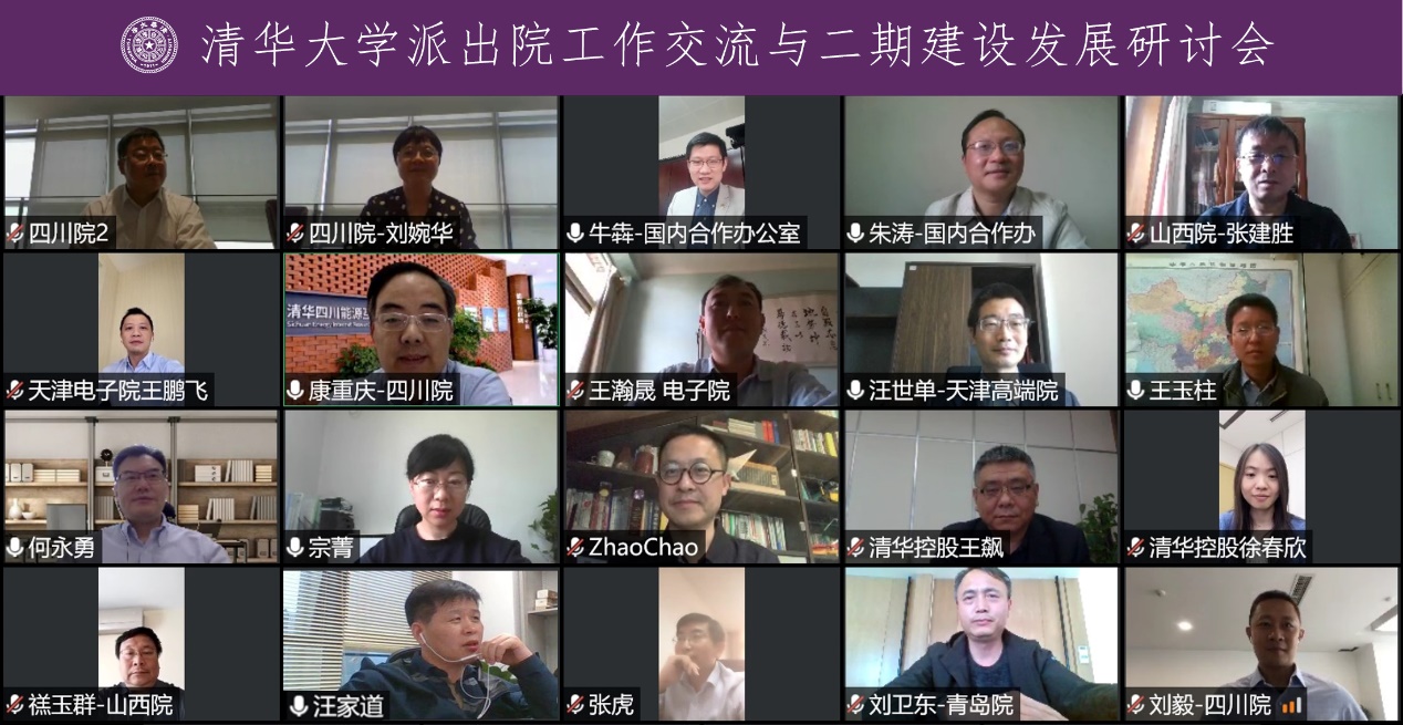清华新闻网5月14日电 迎来二期建设新阶段的清华大学派出研究院,如何抓住机遇服务学校“双一流”建设和地方经济社会发展?5月12日,由清华大学国内合作办公室主办、清华四川能源互联网研究院承办的清华大学派出院工作交流与二期建设发展研讨会在线上举行。清华天津高端装备研究院、清华天津电子信息研究院、清华山西清洁能源研究院和清华四川能源互联网研究院相关负责人以及清华大学国内合作办公室、科研院科技开发部、技术转移研究院和清华控股相关负责人参加会议。会议由清华大学电机系系主任、清华四川能源互联网研究院院长康重庆主持。