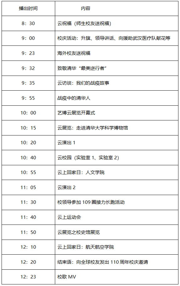 4月26日上午8:30,清华大学109周年校庆特别报道将通过清华109周年云校庆网站、人民日报客户端、教育部政务新媒体“微言教育”、中国电信天翼云直播平台、清华大学央视频号、微博、抖音号、快手号、哔哩哔哩号、百家号等平台面向全球直播。