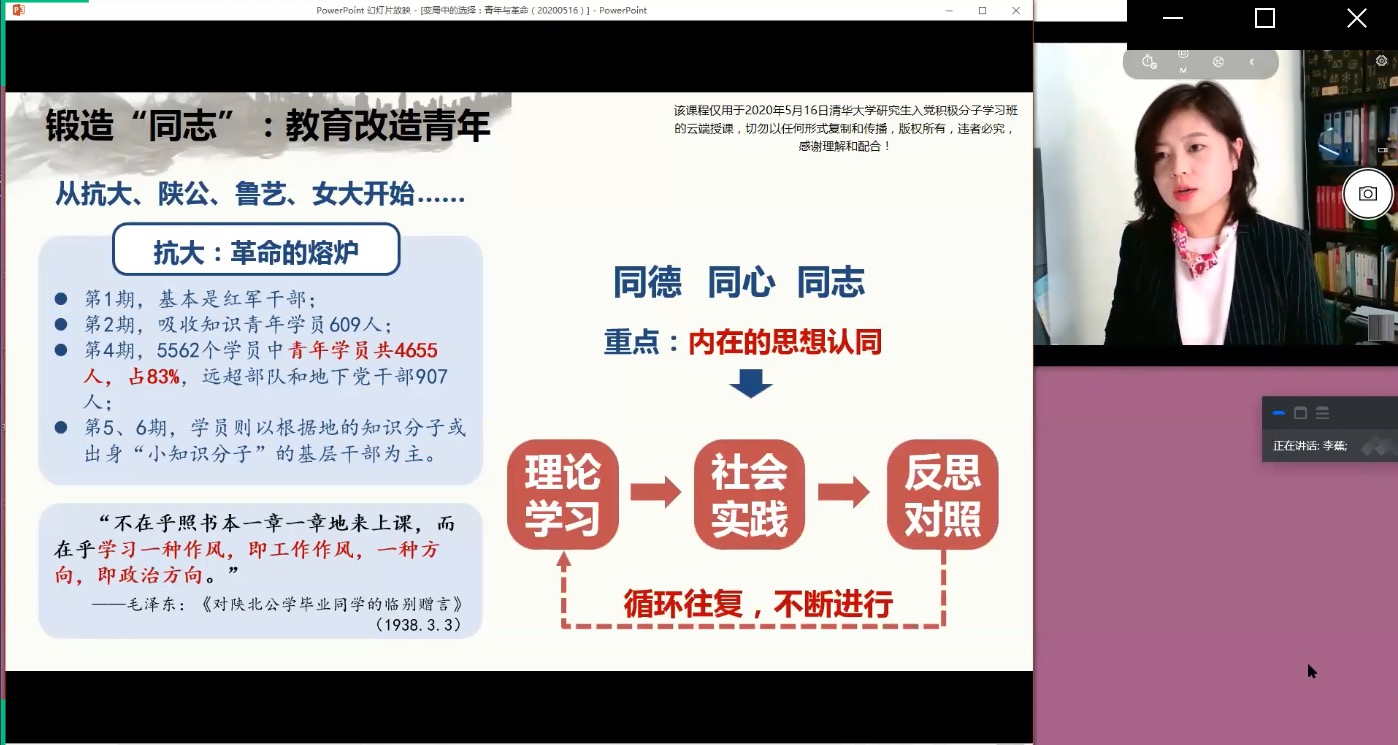 清华新闻网5月22日电 为深入学习贯彻习近平新时代中国特色社会主义思想和党的十九大以及十九届二中、三中、四中全会精神,帮助研究生入党积极分子进一步树立共产主义理想信念,端正入党动机,了解党的章程,熟悉党的历史,深入学习党的基本理论和知识,明确党员义务和权利,清华大学党委研究生工作部举办2020年春季学期研究生入党积极分子学习班。5月14日至16日,校图书馆党委书记蒋耘中、马克思主义学院副教授李蕉、马克思主义学院助理教授林毅、校党委研究生工作部思教办主任任仕廷分别作专题辅导报告。来自全校39个院系的800余名研究生入党积极分子参与学习。