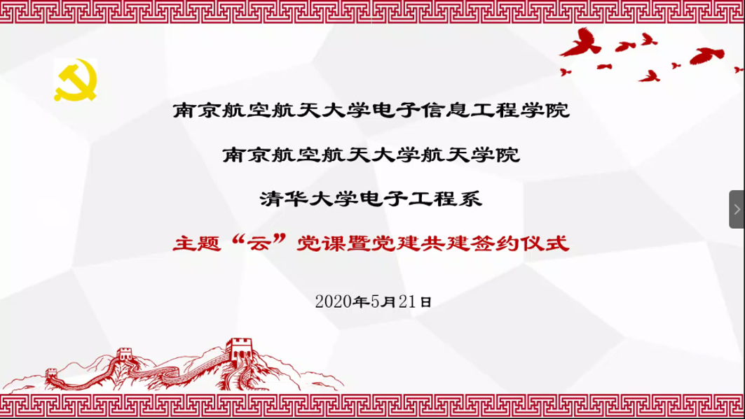 三院系党支部代表线上签署了《南京航空航天大学微波光子学实验室研究生党支部、航天学院本科生联合党支部、清华大学光电所研究生党支部共建协议》。协议明确以“党建引领、业务互助、优势互补”为共建目标,同时就共建的内容措施以及要求进行了说明。