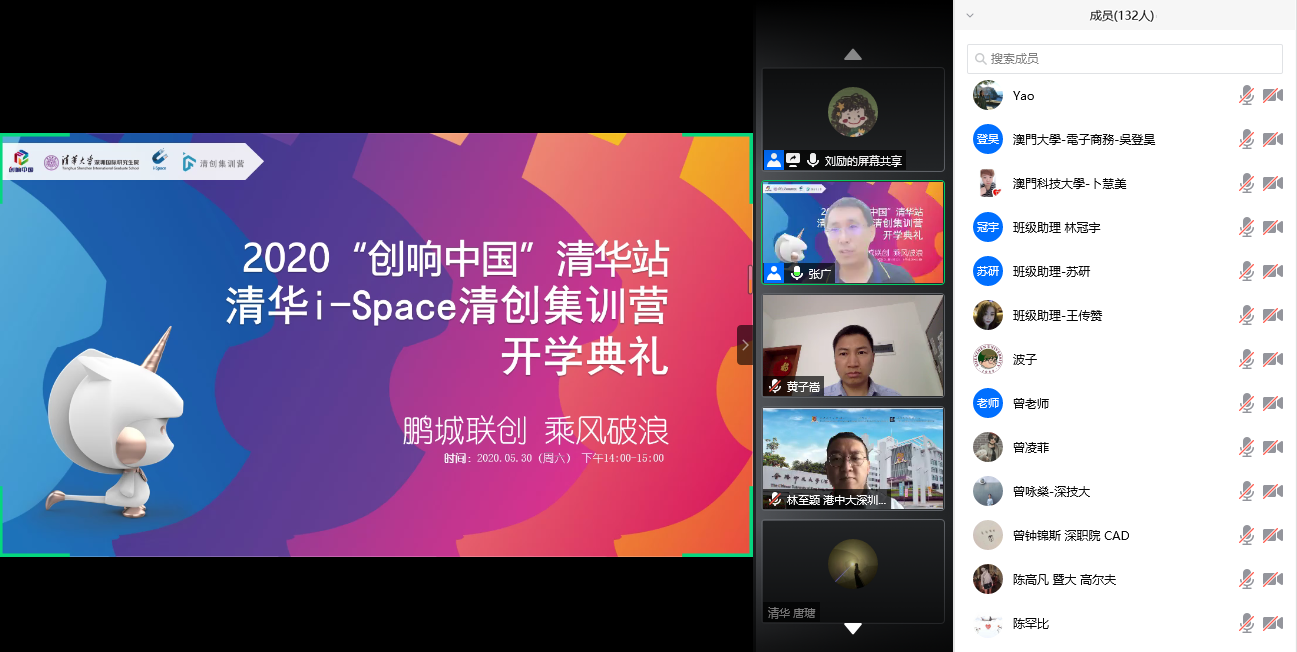 清华新闻网6月1日电 5月30日下午,深圳国际研究生院通过线上直播的方式举行了“2020清华i-Space清创集训营开学典礼”。作为2020“创响中国”清华站系列活动之一,清创集训营聚焦创新创业人才培养,致力于推动高校创新创业教育模式创新和深入联合。130余位来自粤港澳大湾区各高校的参营学生、创新创业教育主管领导和教师代表共同见证了这场湾区联动的创新创业集训营的开幕。开学典礼由i-Space张广老师主持。
