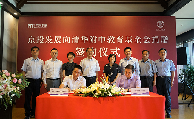 筹建办学签约仪式后,举行了京投发展向清华附中教育基金会捐赠签约仪式。王殿军代表清华附中教育基金会接受捐赠。本次捐赠资金将用于清华大学附属中学教育教学设施设备的建设。