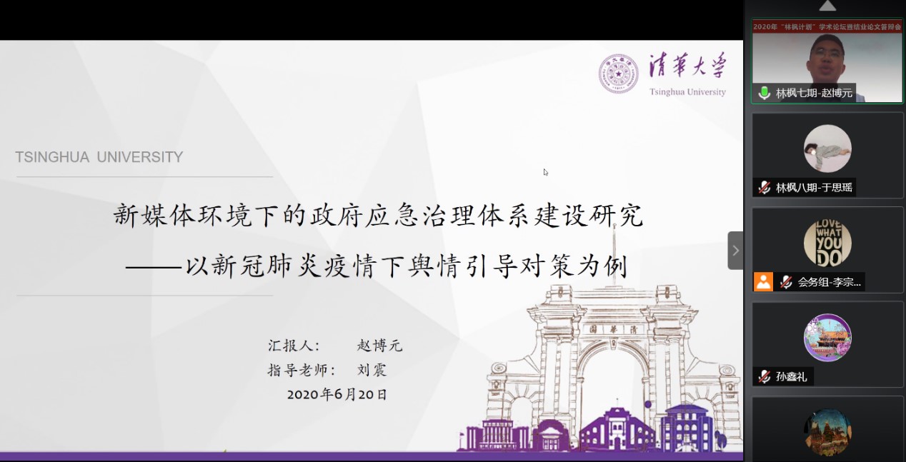 清华新闻网6月28日电(通讯员 甘文灼 李岩)6月20日,清华大学马克思主义理论研究学生因材施教计划(“林枫计划”)学术论坛暨结业论文答辩会在线举行,校党委学生部部长白本锋,马克思主义学院副院长王雯姝、党委副书记何建宇,马克思主义学院教授王峰明、杨金海、王传利等13位“林枫计划”导师、党委学生部部分教师代表以及“林枫计划”第六、七、八期学员等80多名师生参加论坛。