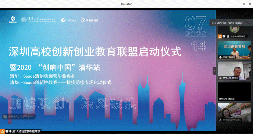 清华新闻网7月15日电 7月14日下午,清华大学深圳国际研究生院通过线上直播的方式举行深圳高校创新创业教育联盟启动仪式。130余位来自粤港澳大湾区17所高校的创新创业教育主管领导、教师、学生及联盟支持单位代表共同见证了深圳高校创新创业教育迈入深入合作的新阶段。同时组织举行的还有联盟全体成员单位参与的两场重要活动——2020“创响中国”清华站清创集训营毕业典礼和清华i-Space创新挑战赛(抗疫防疫专场)启动仪式。