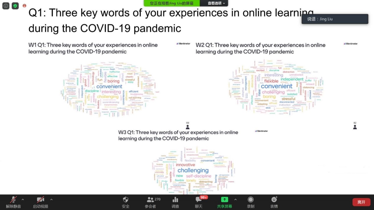 提问结束后,刘靖用关键词词云的方式展示了三次工作坊中,同学们关于疫情之下在线教育的感受,以及对未来高等教育模式的想象,勾勒总结了同学们的观点和收获。