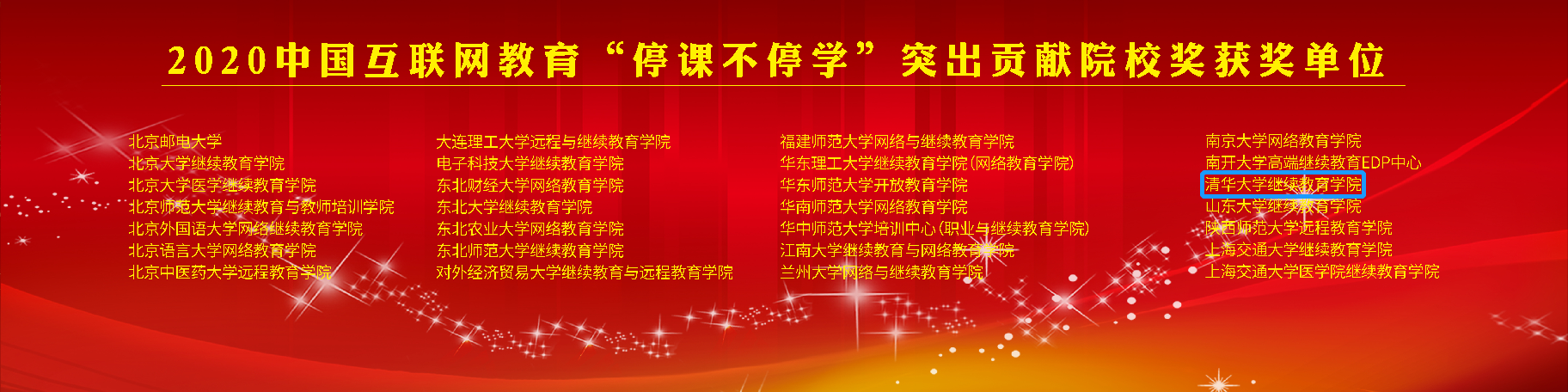 “停课不停学”突出贡献院校奖评选由全国高校现代远程教育协作组和《中国远程教育》杂志社联合开展,经院校申请、专家评审,共评出86家“停课不停学”突出贡献院校,以此记录在新冠肺炎疫情这次特殊事件中行业众志成城、攻坚克难的奋斗历程。获奖院校名单在7月24日云端举办的2020(第五届)中国互联网教育大会上发布。