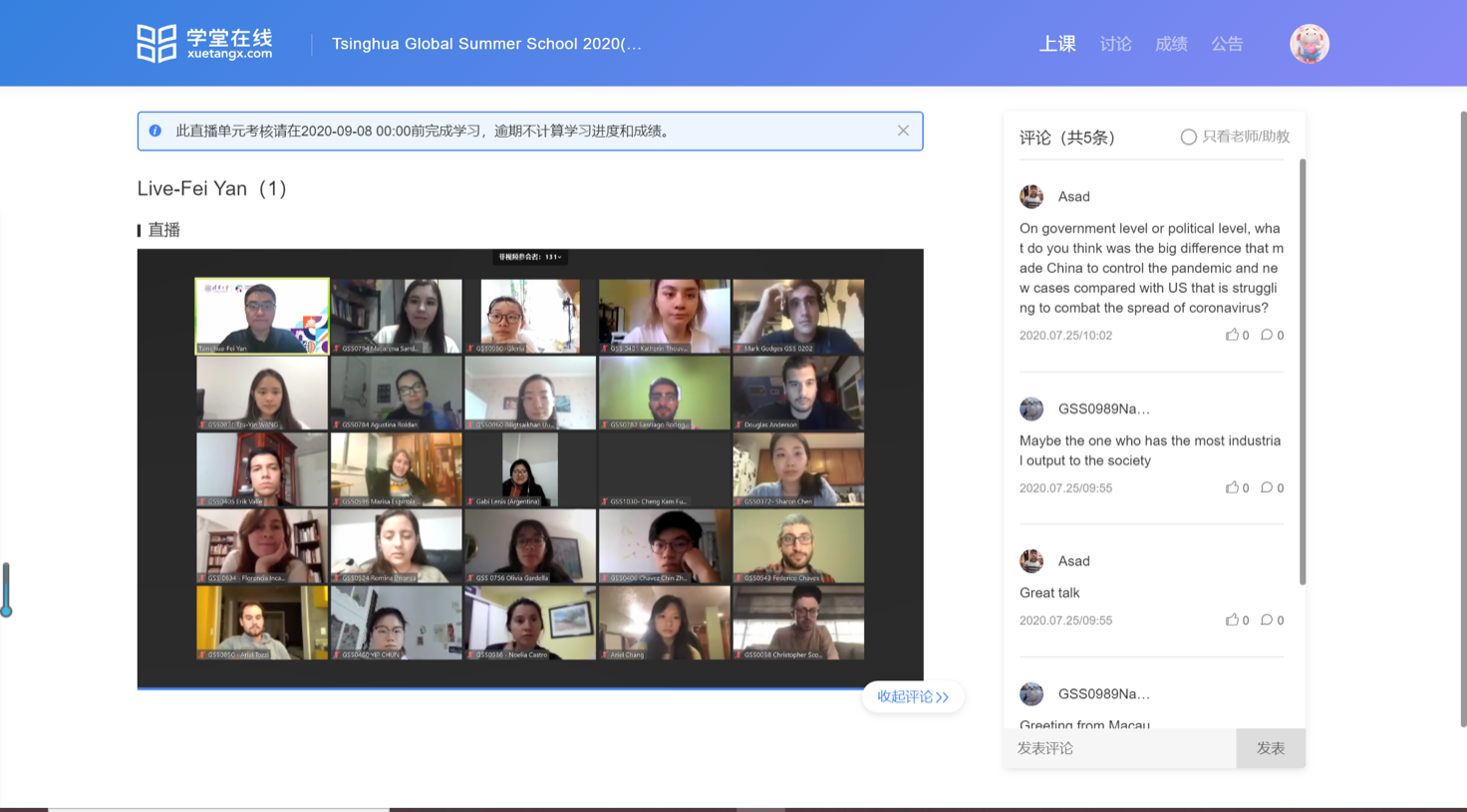 清华新闻网7月26日电(通讯员张宁宁 刘翘楚)北京时间7月25日,清华大学2020年全球暑期学校(GSS 2020)第六日,由清华大学社会科学学院提供学术支持的暑校系列课程——“后疫情时代的社会”顺利开展。
