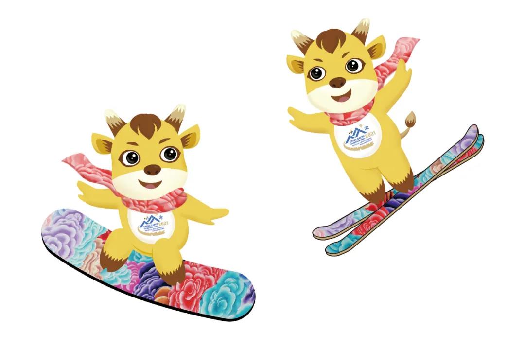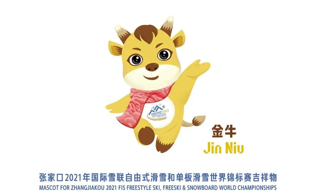 吉祥物“金牛”的命名和形象设计灵感来源于2021年中国生肖牛年。生肖作为中国民俗文化的代表和传统文化精髓的体现,越来越受到世界的关注,以卡通牛的形象为设计基础,表达了对中国新年的祝福。“金牛”诠释了张家口人民勤劳淳朴、刚毅执着、开拓创新的良好形象,以金色为主色调,搭配新年“中国红”服饰元素,有金牛贺岁、欢乐祥瑞的寓意;它活泼灵动、俏皮可爱,与自由式滑雪和单板滑雪的冬季极限运动特性相契合,体现了冬季冰雪运动特点。
