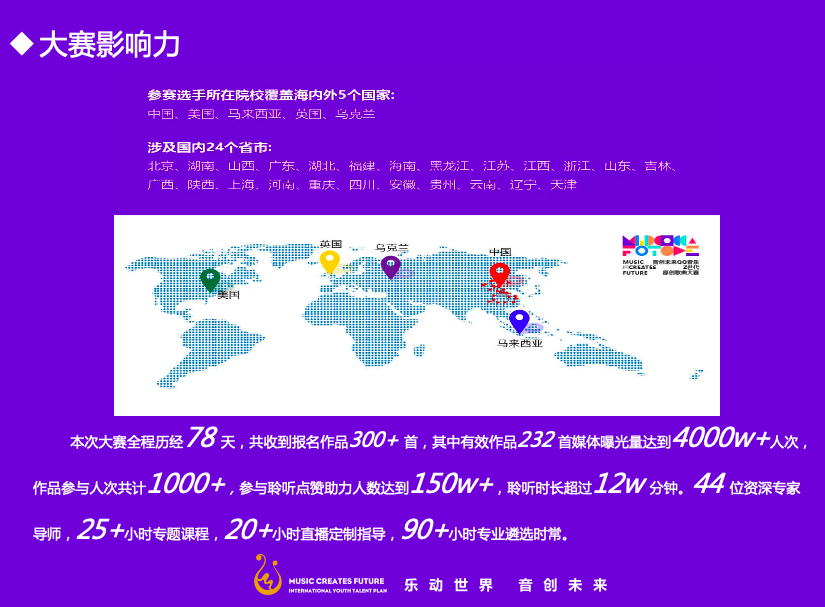 音创未来QQ音乐“Z世代原创歌曲大赛”自7月4日启动至9月19日落幕,从“追忆、Z世代、责任、憧憬”四大主题出发,面向1995-2009年间出生的学生群体征集原创作品。大赛共收到作品300余首,参赛选手来自5个国家,覆盖国内24个省市。网上的活动参与人次超过150万,聆听时长达到12万分钟。本次大赛还组织了44位专家导师,打造了近50个小时的专题课程及直播定制指导。