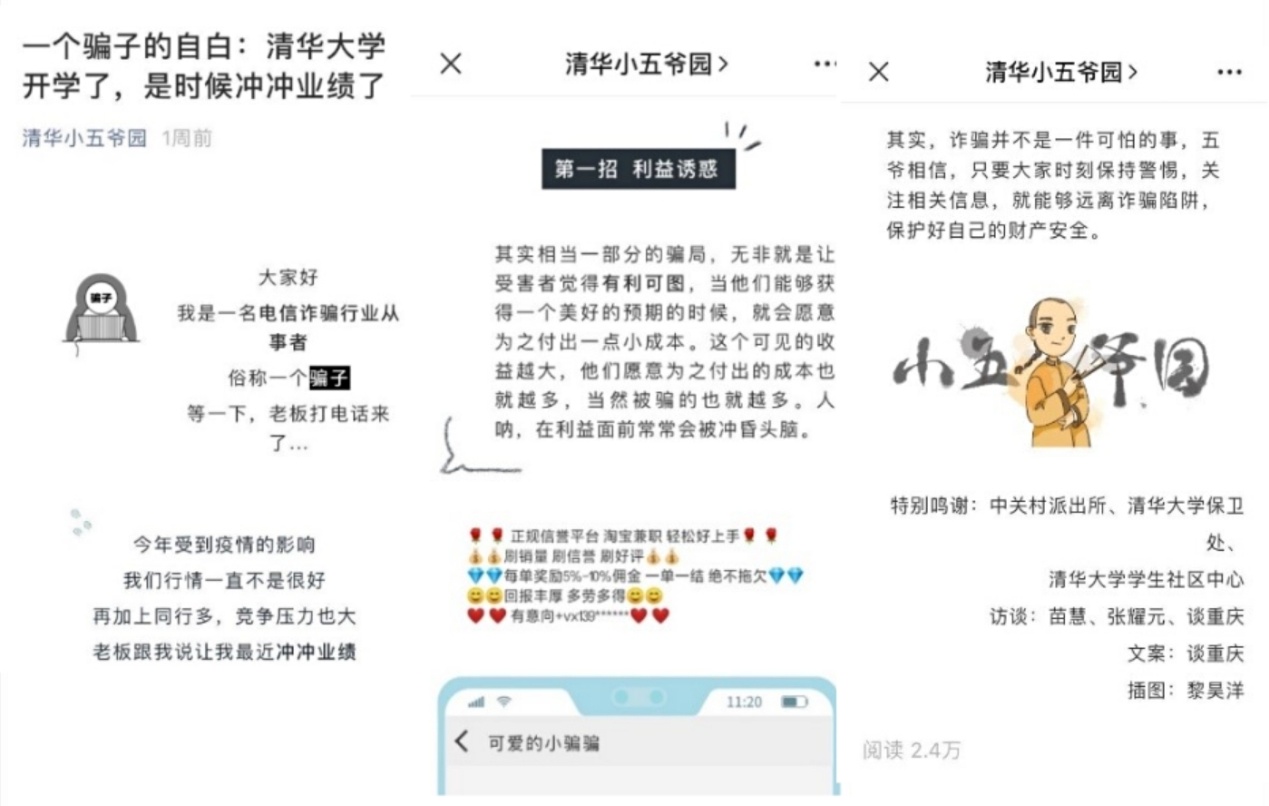 在线下,“钓鱼邮件防范”巡展活动以及滚动大屏展播走进60余家院系单位和学生社区。在线上,依托网络和新媒体平台“清华信息化”“平安清华”和“清华小五爷园”等微信公众号发布《网络安全,清华教你怎么做》、《一个骗子的自白:清华大学开学了,是时候冲冲业绩了》等多篇宣传推送,用贴近青年学生的方式介绍网络安全相关知识和防电信诈骗方法,提升师生网络安全意识,营造清朗、安全、有序的网络环境。