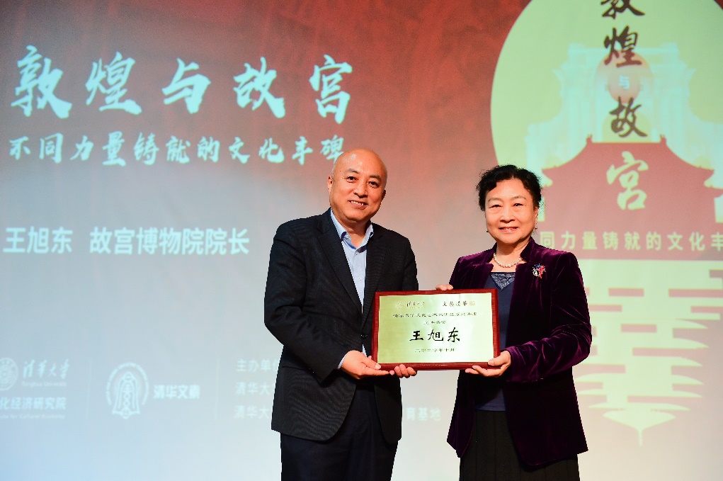 最后,中国政策科学研究会副会长、清华大学文化经济研究院顾问委员会主席、原文化部副部长赵少华为王旭东院长颁发了“清华大学文化艺术大讲堂”纪念奖牌。千年石窟,文化交融;百年紫禁城,宫阙巍峨。通过本场文化艺术大讲堂,清华师生共同聆听和感受了中国文化的传统与经典、力量与创新。