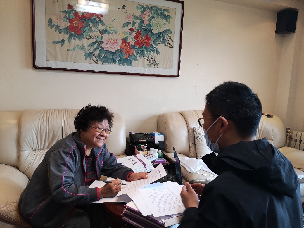 王锡瑞(左一)在膝关节置换手术后,请研究生党建助理来家中讨论党员发展工作