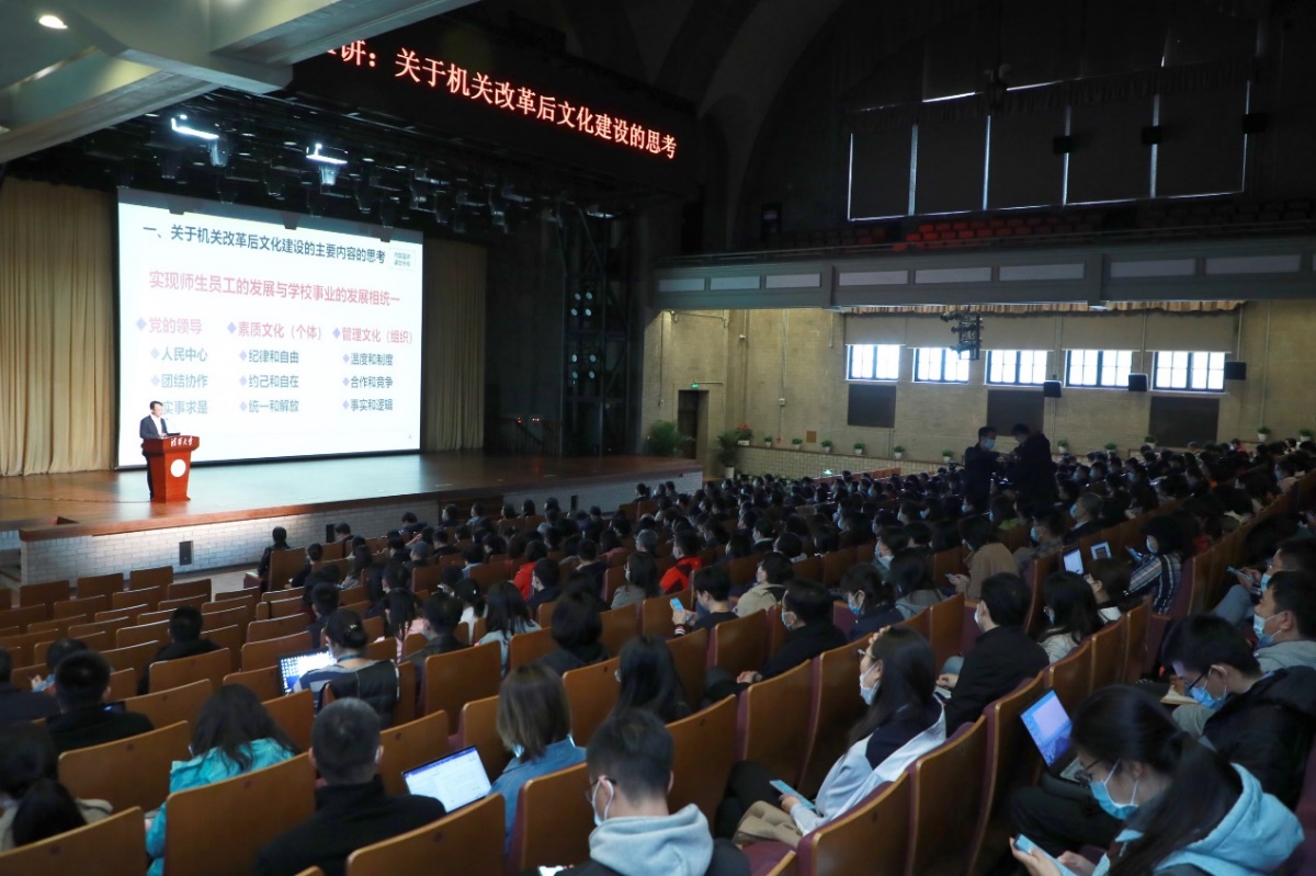 王希勤围绕机关改革后文化建设主要内容、中国特色现代大学办学模式、个人发展、组织发展、个人发展与组织发展相统一等内容进行深入解读。王希勤表示,中国特色现代大学的根本是要坚持党的领导,坚持以人民中心的价值取向,在大学建设中要发挥团结协作的组织优势,坚持实事求是的思想方法,实现师生员工的发展与学校事业的发展相统一。他指出,目前教育也同样面临百年未有之大变局,清华要努力建设中国特色现代化大学,探索中国特色现代大学的治理体系和办学模式,践行中西融汇、古今贯通、文理渗透的办学风格,促进现代文明和传统文化融合。
