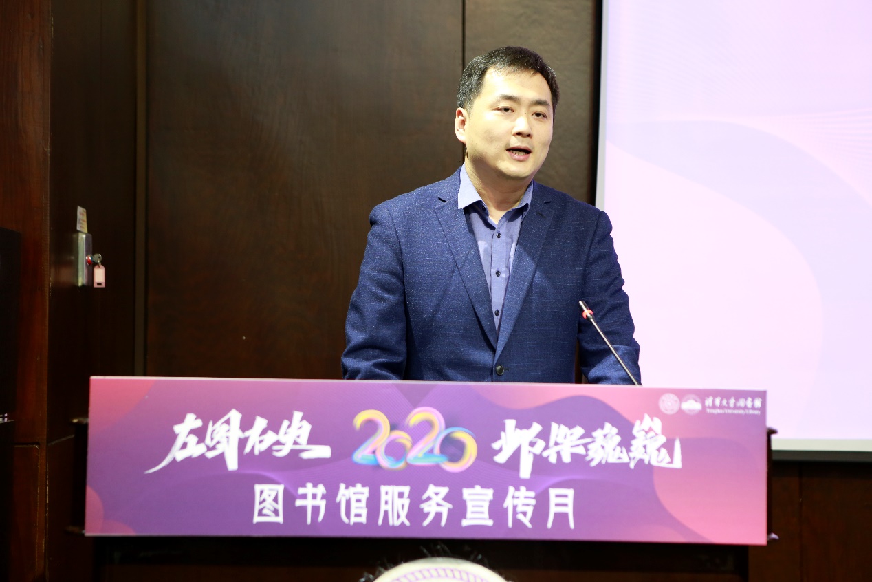 随后,王有强分享了对“图书馆是大学的心脏”这句话的理解,围绕“HEART”,解读了图书馆在大学发展过程中的独特作用。图书馆为学校的教学提供保障(Teaching),是学校的资源中心(Resources)和学术支撑(Academic),同时图书馆也是师生们探索知识、发现真理的空间(Explore),更用阅读为大家带来希望(Hope)。王有强表示,服务宣传月既是对图书馆近两年工作的回顾与总结,更是对图书馆未来发展的展望与规划。本届宣传服务月通过构建全媒体宣传网络,向全校师生推广图书馆新资源、新服务,与读者建立全方位、多方面的互动,引导、鼓励、邀请读者参与图书馆宣传推广活动,提升图书馆的资源使用价值和读者参与度。希望广大师生能够通过服务宣传月的活动,了解图书馆、使用图书馆、爱上图书馆、建设图书馆、情系图书馆!