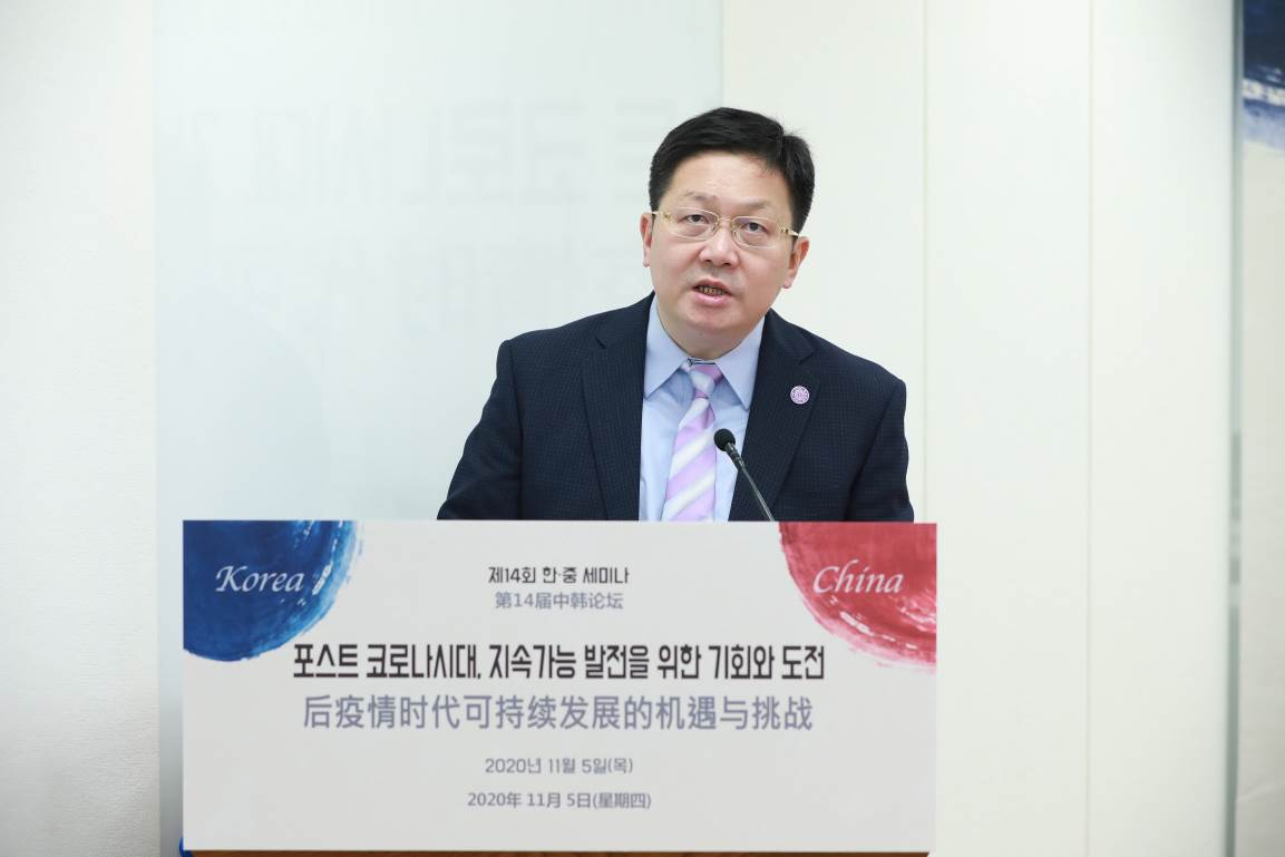 郑力在视频致辞中指出,中韩两国在共同抗击疫情中守望相助,风雨同舟。期间,习近平主席同文在寅总统保持良好沟通,就深化双边关系、加强抗疫合作等达成重要共识。在两国元首战略引领下,中韩关系保持良好发展势头。后疫情时代,两国通过构建五个“共同体”,推动中韩关系迈向新台阶。本次中韩国际会议的主题与中韩两国政府和人民关注的焦点,以及未来中韩共同发展的方向高度契合。希望与会专家畅所欲言、深入探讨,用智慧与担当,共同构筑后疫情时代可持续发展的可期未来。