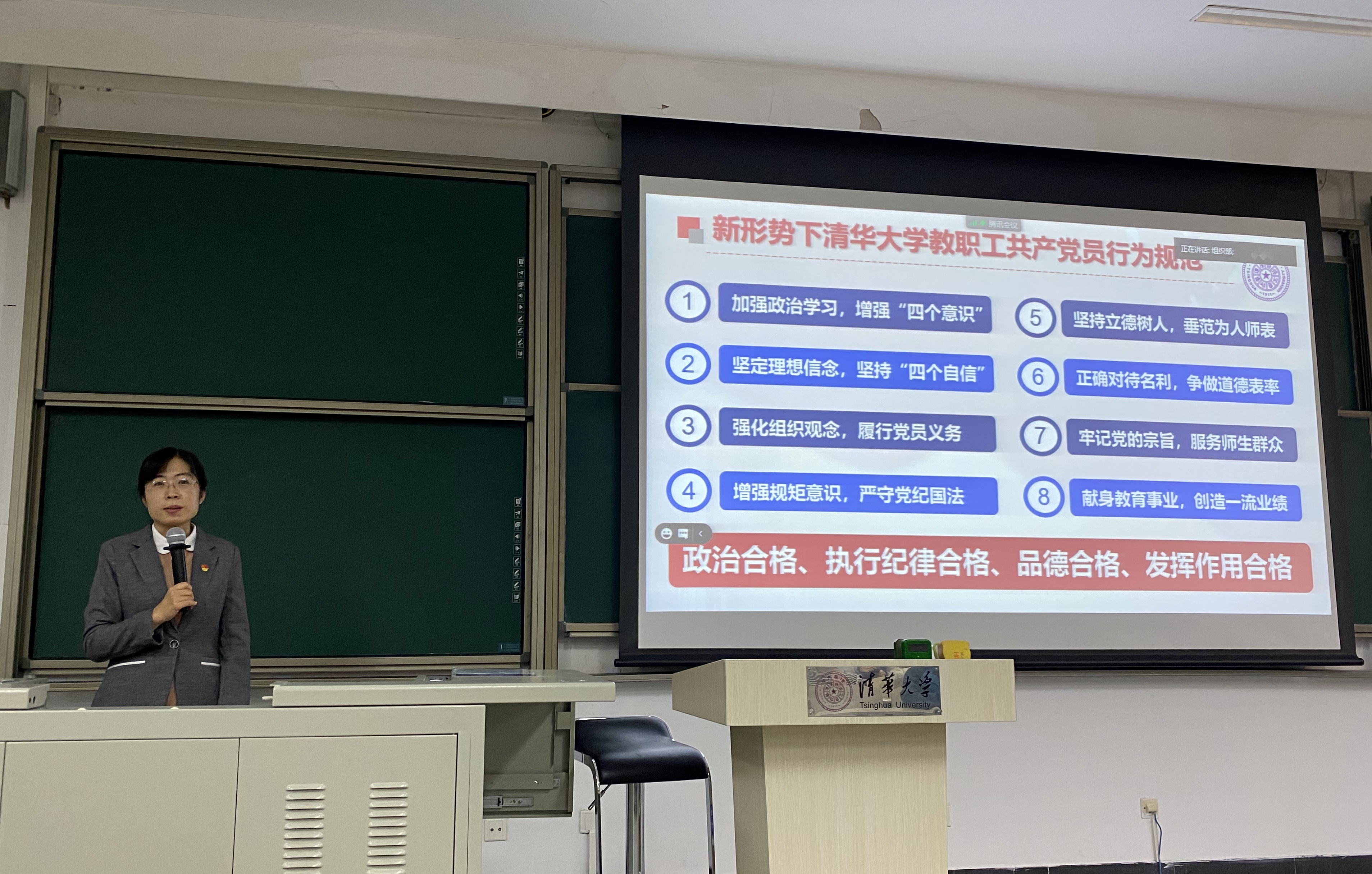 党委组织部专职组织员梁静主持本次集中学习,为大家讲解了新形势下清华大学教职工共产党员行为规范与预备党员教育、考察和转正有关事项,并鼓励各位新党员要牢记入党初心、主动担当作为,在今后的工作中不仅要强化理论知识学习、不断坚定理想信念、持续深化思想入党,更要立足本职岗位、勇于开拓创新,对照先进典型和身边榜样,用党员的标准严格要求自己,为推进学校各项事业发展作出自己的贡献。