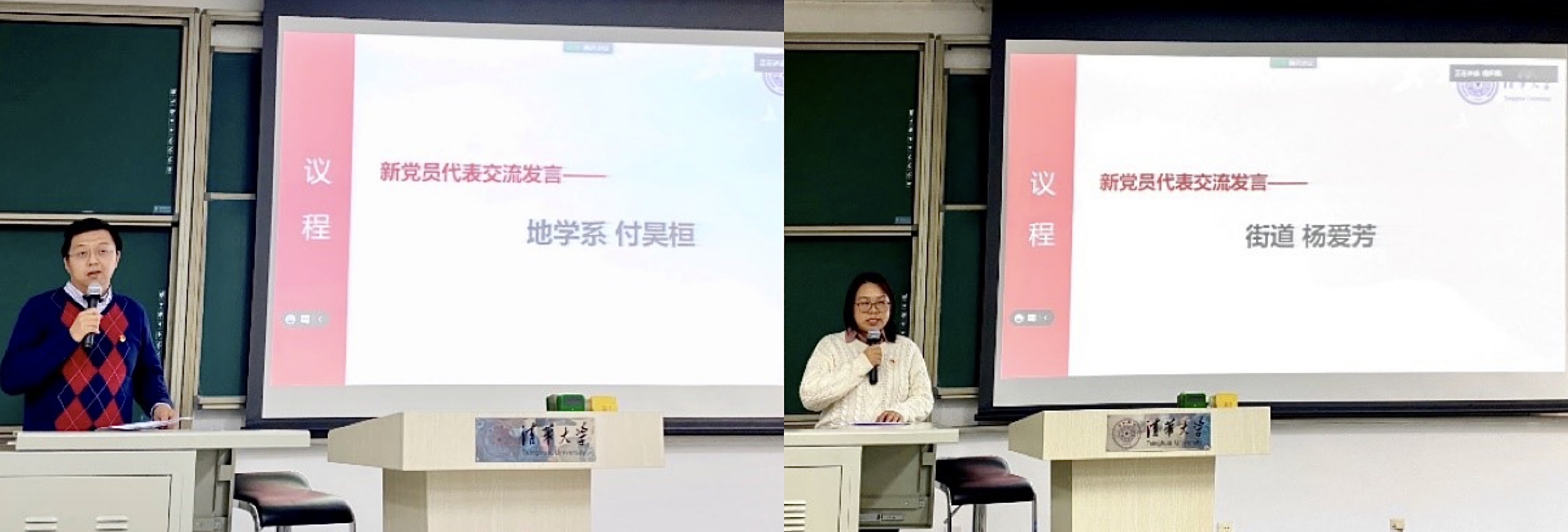 随后,地学系教授付昊桓和街道西南社区职工杨爱芳作为新党员代表分享了自己加入党组织以来的感受与体会。付昊桓分享了自己入党的心路历程和参加领航工作站的感受,他深刻体会到党的正确领导和国家的繁荣富强永远是科技工作者攀登高峰最坚强的后盾,并表示在今后的工作中将不忘初心,充分发挥党员的先锋模范作用,承担青年教师的使命担当。杨爱芳作为学校今年八位在抗疫一线入党的党员之一,在发言中分享了疫情防控以来自己奋战在社区防疫一线的情况。她表示,自己此次能在一线入党是荣光,更是使命与责任,今后将始终以优秀党员的标准严格要求自己,继续用实际行动践行入党的铮铮誓言。新党员还集中观看了党委宣传部制作的优秀共产党员事迹宣传片,学习了先进人物潜心教学科研、追求卓越、无私奉献的优秀品格,增强了自身的使命感和责任感。