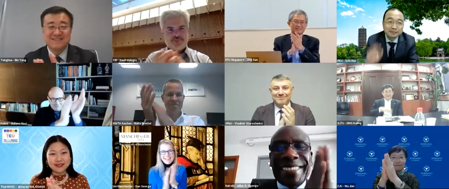 清华大学副校长、教务长杨斌,校务委员会副主任袁驷与来自美国康奈尔大学、法国交叉科学研究院、美国edX平台、蒙古科技大学、新加坡南洋理工大学、北京大学、意大利米兰理工大学、美国莱斯大学、德国亚琛工业大学、俄罗斯圣彼得堡国立大学、上海交通大学、泰国Thai MOOC平台、新西兰奥克兰大学、智利大学、英国曼彻斯特大学、肯尼亚内罗毕大学、加拿大多伦多大学、学堂在线、浙江大学的联盟创始成员代表相聚“云端”,共谋交流合作新发展,为即将于12月11日世界慕课大会上正式发布的世界慕课联盟奠定良好基础。
