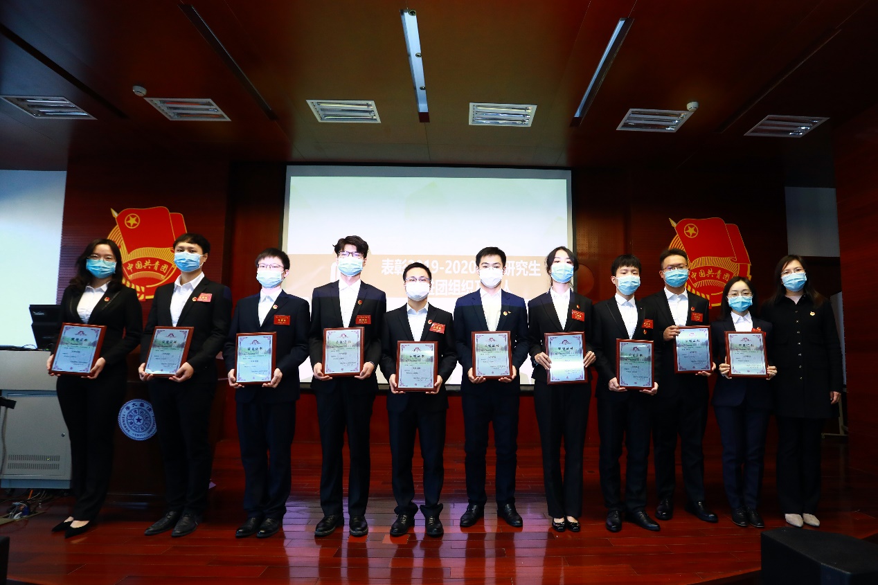 会议表彰了过去一年涌现出的先进集体和优秀个人,授予水利系研究生团总支等10个院系研究生团组织“2019-2020学年度清华大学优秀研团”荣誉称号,授予机械系研究生团总支等4个院系研究生团组织“工作进步奖”荣誉称号,表彰林晨等10名研究生同学“优秀学生干部标兵”。赵岑宣读表彰名单,党委研究生工作部副部长钱婷、徐鹏、兰旻分别为获奖集体与个人颁奖。