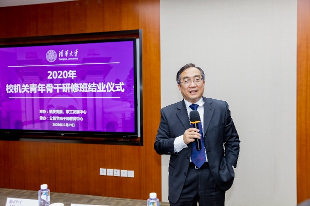 清华新闻网12月7日电 (通讯员 林源)11月29日,由校机关党委、职工发展中心主办,公共管理学院干部教育中心承办的2020年校机关青年骨干研修班在公管学院举行结业式。宣传部常务副部长、新闻中心主任覃川,政策研究室主任孙海涛,发展规划处副处长孙炘,国际处原副处长杨庆梅,终身教育处副处长王雷出席结业式。结业式由校机关党委常务副书记、组织部副部长欧阳沁主持。
