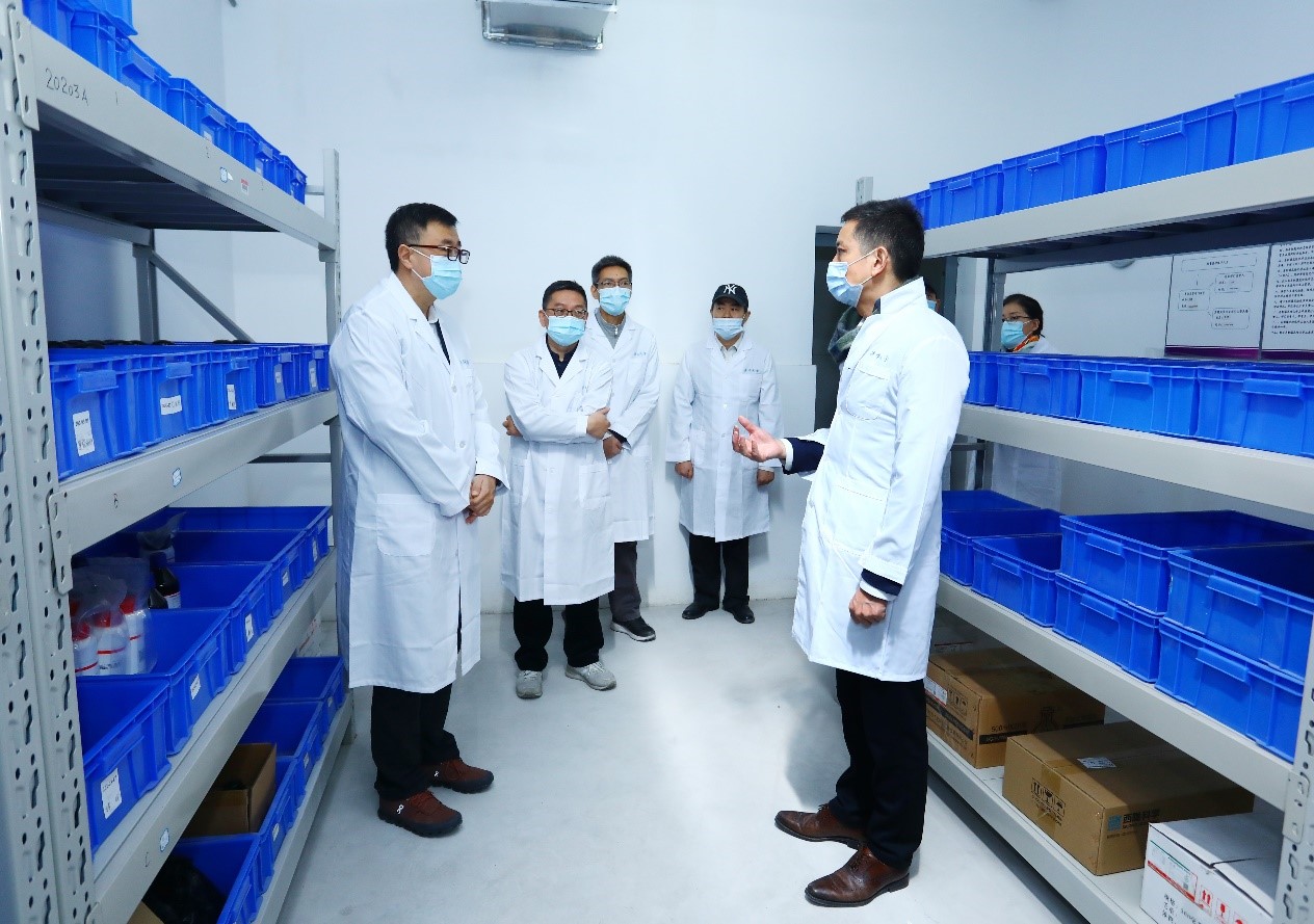 在试剂材料库,杨斌向材料库视频监控室值班人员了解值机值守情况。实地查看易制毒库、危化品库、废液库等试剂材料库,听取实验室处负责人介绍近年来试剂材料库的发展状况、日常管理、应急处置等情况,叮嘱工作人员严格按照规范做好试剂材料管理,以确保安全。