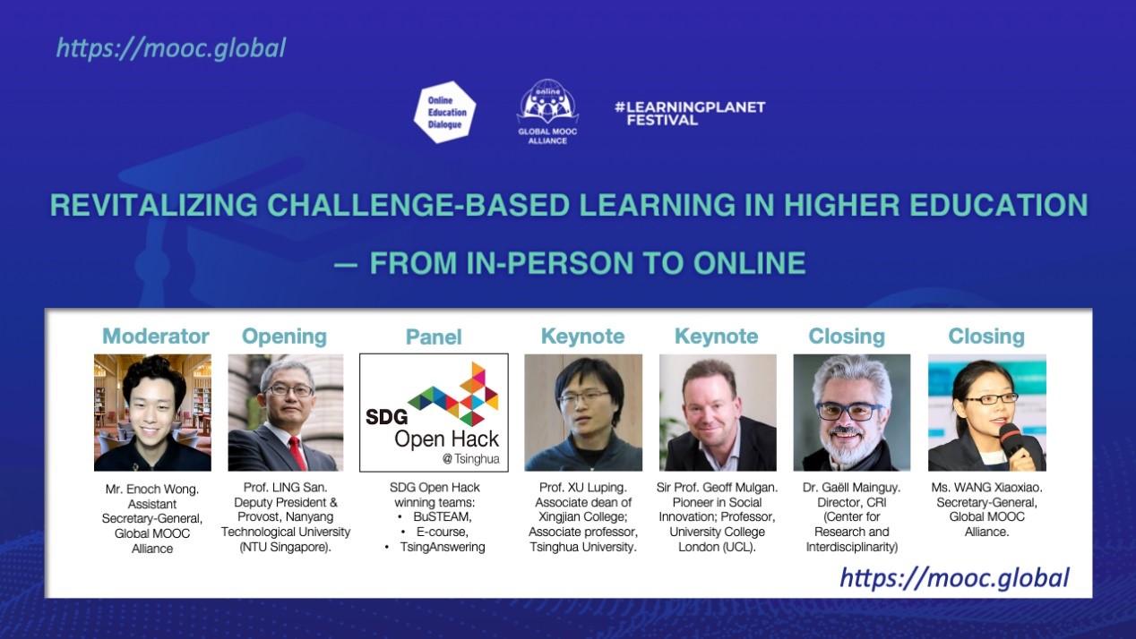 清华新闻网1月29日电 北京时间1月26日下午,2021在线教育对话系列(一)“高等教育中挑战式学习的繁荣——从线下到线上”在线交流通过学堂在线国际版直播。本次在线交流由世界慕课联盟秘书处提供支持,围绕2021学习星球节(#LearningPlanet Festival)“学会关爱自己、关爱他人、关爱世界”和联合国教科文组织国际教育日“为新冠一代恢复和振兴教育”主题展开,学习星球节由法国交叉科学研究院(CRI)和联合国教科文组织共同发起。