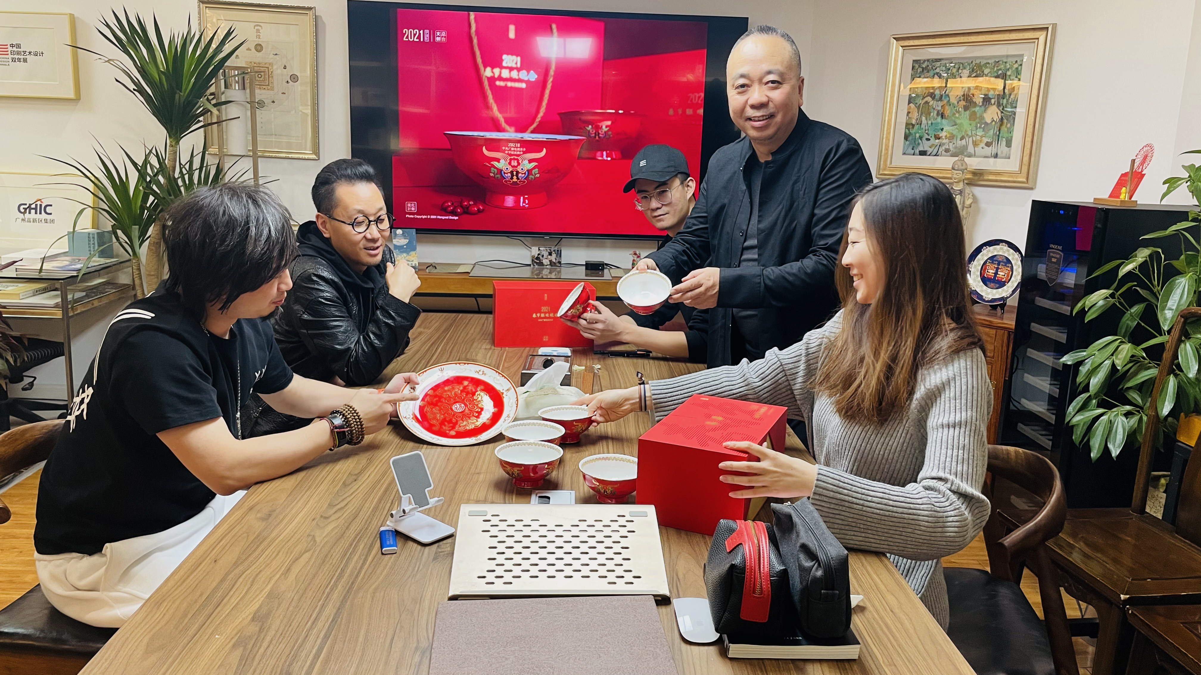 一套精巧的“春碗”背后,是从设计、管理、协调、监理,到陶瓷烧制、花纸印刷、筷子制作、包装生产、装配运输等每一个环节,环环相扣、通力合作的结果。设计团队不懈努力、紧密配合,将设计以最完整、最精良的形态展现在大家的眼前,从陶瓷生产到包装装配,力求完美,每一个步骤都精益求精。历经7个多月各环节的紧密协作,凝聚了团队心血的沉甸甸的“福牛春碗”终于由图纸变成了实物,它承载着设计师与工匠们无数日夜的细琢精雕,释放出流光溢彩。