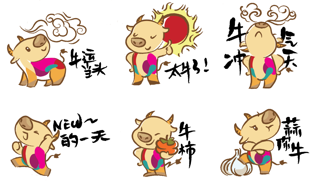 团队的工作远不止制作《小昂》本身。在《小昂》定稿之前,设计团队勾画了数套吉祥物形象方案,如神话传说中的草药牛、强身健体的武术牛、民俗风格的折纸牛等,以及央视春晚logo方案。