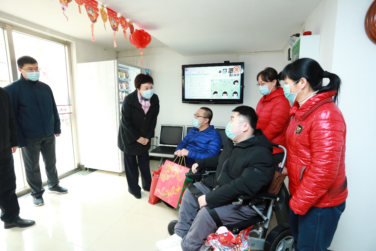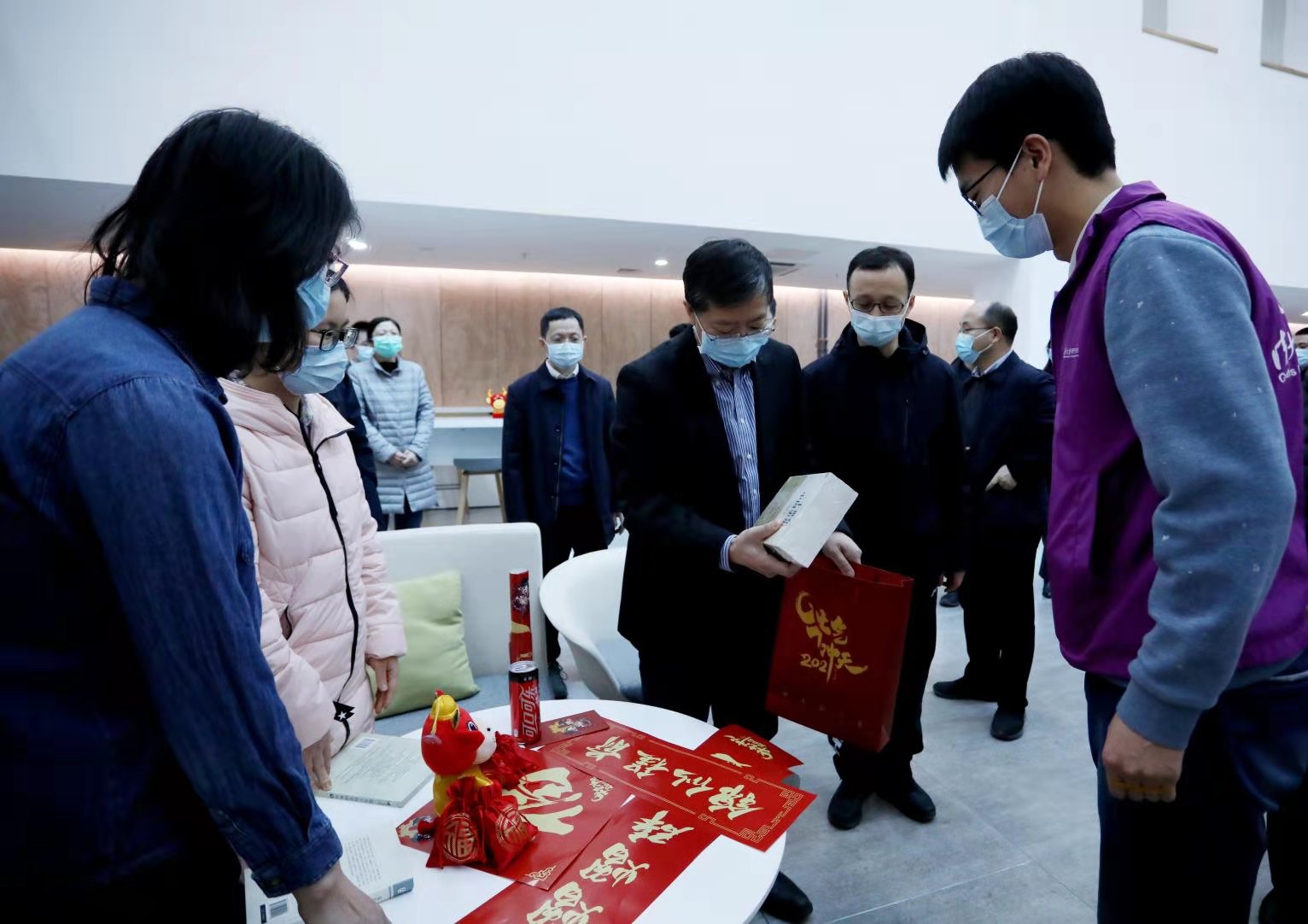 随后,陈旭一行来到紫荆20号楼大厅,看望陈斌和魏祥两位留校学生代表。陈旭详细询问两位同学的学习生活情况并表示,希望你们能在学校度过一个特殊、难忘、祥和的春节,学校会为同学们顺利完成学业提供应有的保障。