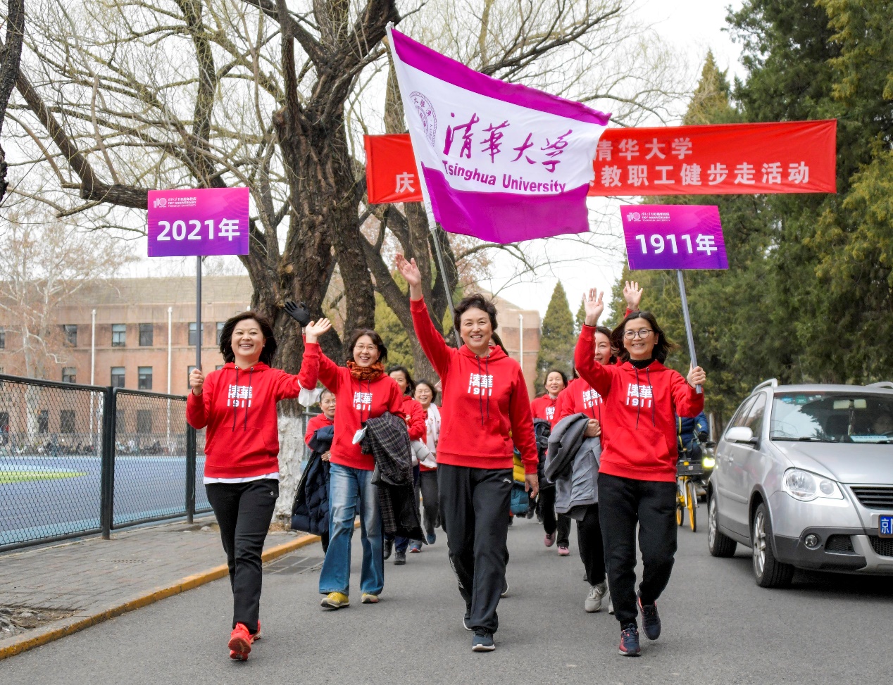 今年正值清华大学建校110周年,活动按照建校时间顺序从1911年到2021年组成了21个健步走队伍。健步走的女教职工中有国家级教学名师、北京市教学名师、北京三八红旗奖章获得者、校女教职工委员会成员、一线教师、院系及部处党政负责人、分工会主席等。共有来自60个分工会的1100多名女教职工参加健步走活动。陈旭加入到第一组队伍中,迈着矫健的步伐,引领队伍行走在美丽的清华园。