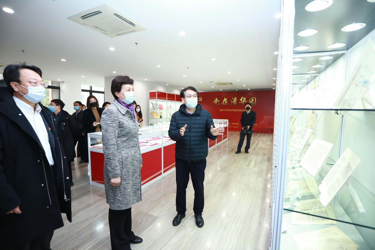 陈旭一行首先听取了党史研究室主任、档案馆馆长范宝龙的介绍,并在工作人员带领下仔细浏览一件件珍贵而生动的展品。展览选取档案馆、校史馆、图书馆等馆藏的近200件文献、手稿、图书、照片、实物等,展现清华党组织的发展历程和光荣传统。其中有,中共清华第一个支部诞生地三院历史图片、清华第一任党支部书记王达成访问记、1926年至1937年清华地下党历届支部书记名单和清华解放前各时期地下党员名单,学校历次党代会相关档案史料、历届党委书记校长给师生员工讲党课的资料,清华党组织获得的荣誉证书和奖杯,以及清华最早的共产党员施滉、上世纪50年代老知识分子中第一个入党的教授刘仙洲、隐姓埋名捐资助学的“炭火教授”赵家和等清华党史典型人物和优秀共产党员的实物史料等,内容丰富精彩。