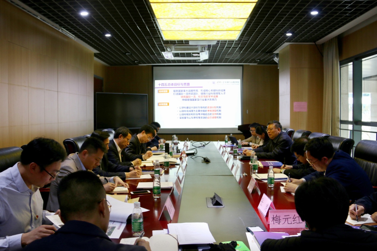 车辆学院党委书记王建强向调研组成员介绍了车辆学院党史学习教育的具体部署和前期进展,院长李建秋介绍了车辆学院近期科研工作进展,分析了“十四五”期间本学科的发展趋势,并重点介绍了“十四五”基础前沿研究和关键核心技术攻关规划、平台建设和成果转化规划。