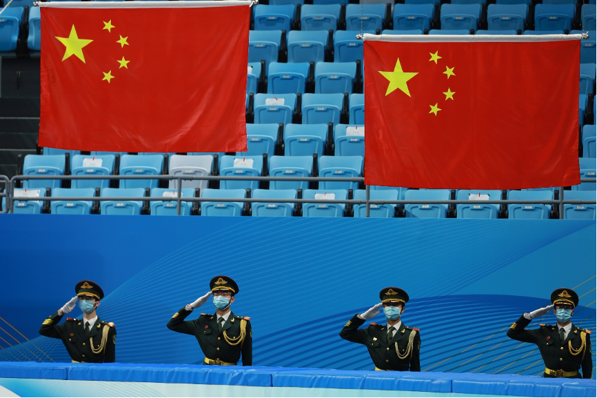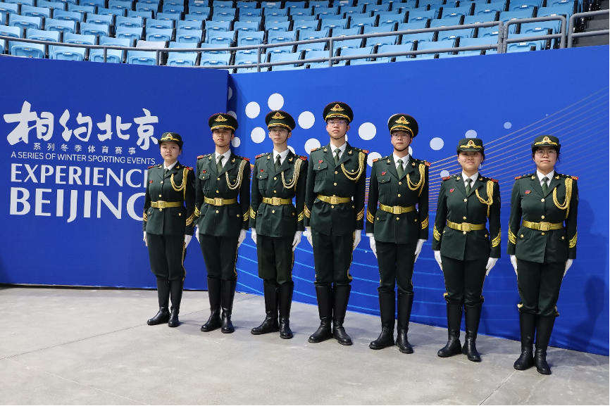 国旗仪仗队志愿者在首都体育馆进行志愿活动。4月10日,在测试赛最后一天的工作中,队员们需连续9次升起国旗。整整一个小时,队员们始终保持挺拔的站姿,纹丝不动,顺利完成升旗任务。国旗仪仗队志愿者、环境学院2019级本科生华天在任务结束后激动地说:“这次任务流程新,排练时间短,但幸不辱命,我们顺利完成了。当我们任务结束,在冰场上喊出‘祖国万岁,青年加油’的那一刻,我深深地为之感到自豪!”。