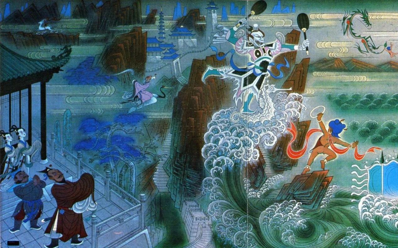 《哪吒闹海》(局部)首都国际机场壁画 重彩画,1979,张仃