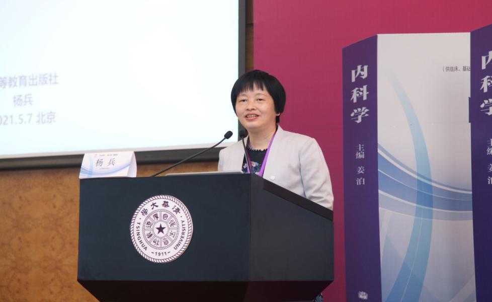 高等教育出版社医学分社首席编辑杨兵编审从新形势下的新要求、高教社的出版创新、《内科学》第二版教材编写要求等三个方面进行了介绍。她提出教材要紧扣国家执业医师考试大纲要求,强调理论知识与临床实践紧密联系,培养医学生的临床思维能力,要与住院医师规范化培训相衔接。