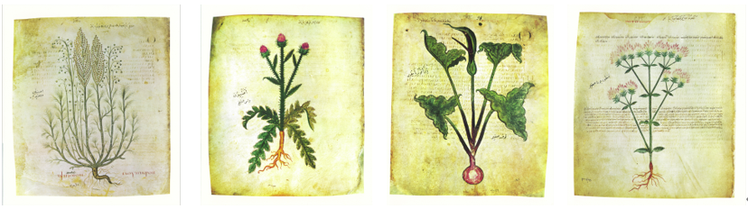 由左至右依次为《论药物》(维也纳抄本)中亚苦蒿、大翅蓟、龙芋、红百金花