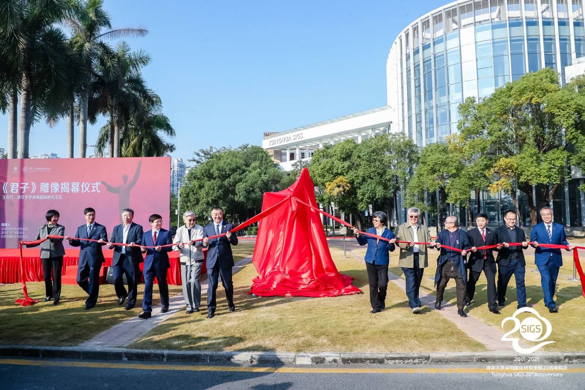 清华新闻网12月12日电 为进一步传承清华精神,传播清华文化,营造良好的校园文化氛围,12月12日上午,《君子》雕像揭幕仪式在清华大学深圳国际研究生院C楼东南草坪隆重举行。清华大学副校长、教务长、深圳国际研究生院院长杨斌,原校务委员会副主任、清华校友总会副会长韩景阳,原常务副校长杨家庆,原副校长、原深圳研究生院院长关志成,校党委常委、组织部部长许庆红,《君子》雕像创作者、清华大学美术学院长聘教授、党委副书记李鹤,清华校友总会副秘书长、清华大学广州校友会执行会长、深圳市力合科创股份有限公司书记、总经理贺臻,深圳清华大学研究院院长、深圳市清华大学校友会监事长嵇世山,清华校友总会秘书长唐杰,东莞市清华大学校友会会长莫沛全以及清华大学深圳国际研究生院执行院长高虹和院党委书记、深圳市清华大学校友会会长武晓峰出席揭幕仪式。清华大学深圳国际研究生院副院长张传杰主持仪式。