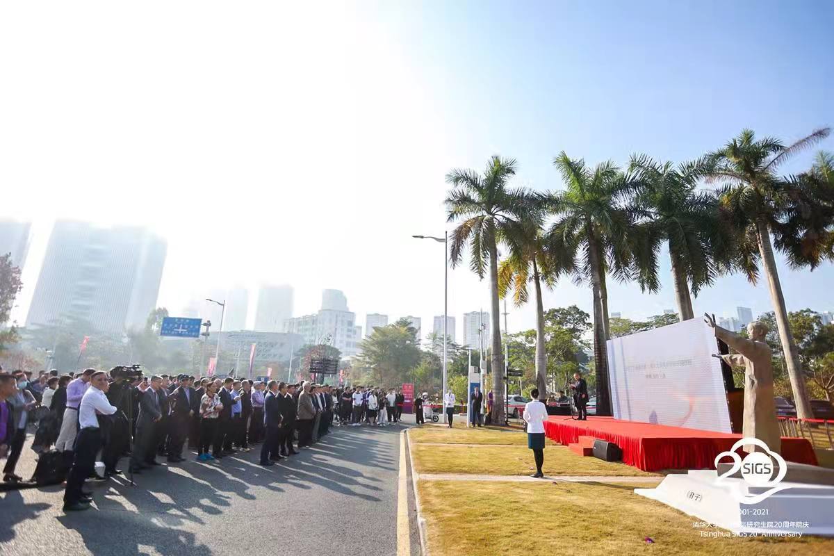 高虹在致辞中表示,今年是清华在深圳办学20周年,学院经历了从初创到发展的蜕变,进入了全新的发展阶段。为进一步在深圳校园中加强对清华文化环境的营造,今年4月,清华大学深圳国际研究生院以清华校训为出发点,设立了“《君子》雕像”捐赠项目,项目得到了深圳市清华大学校友会、清华大学广州校友会、东莞市清华大学校友会等的大力支持,共计320位校友参与捐款,使《君子》雕像得以在院内落成。诚挚期待未来能够继续携手广大校友,让清华精神和文化在南国扎根,一代代传承下去,为国家培养堪当民族复兴重任的时代新人。