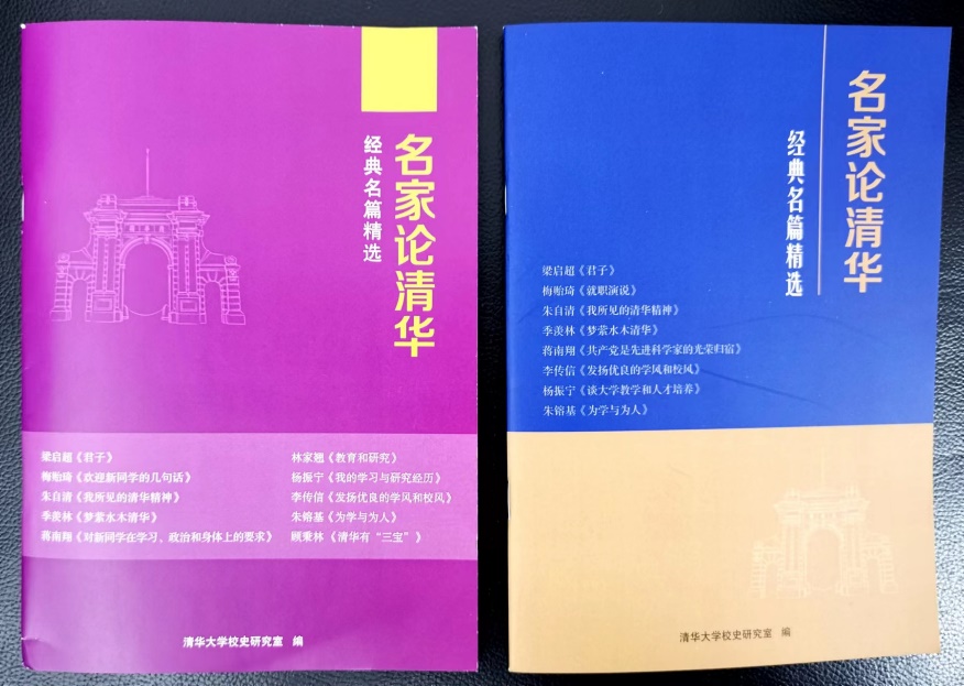 校史研究室还修订完善了新生版和新教工版《名家论清华——经典名篇精选》小册子,从校史馆保存的珍贵史料中分别甄选10篇和8篇经典演讲和文章,提供给不同参观群体取阅。所选文稿尽可能取其最早发表的原始出处,从不同侧面阐释了清华的办学理念、治学传统和精神文化。
