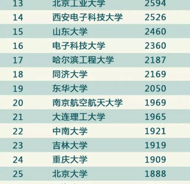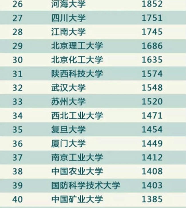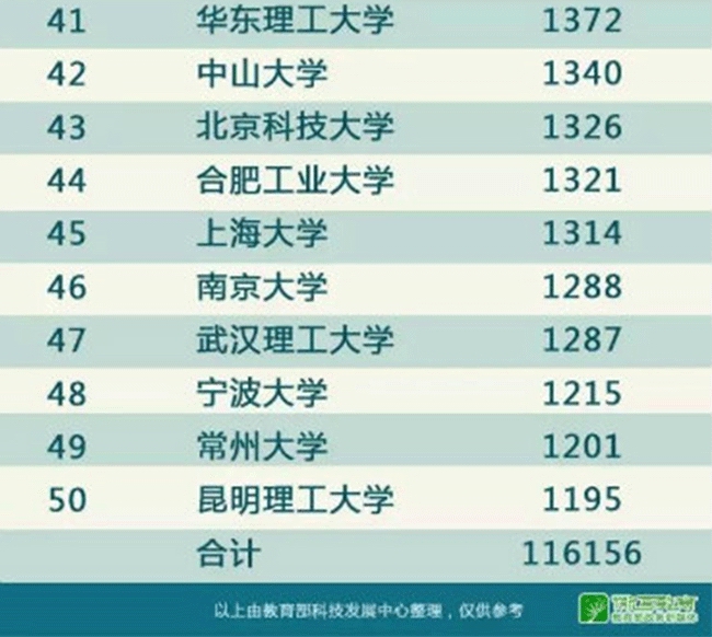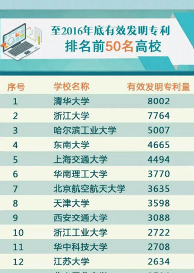 据教育部官方微博“微言教育”消息,教育部科技发展中心近日公布《至2016年底有效发明专利排名前50名高校》,前5名的高校分别为:清华大学8002件、浙江大学7764件、哈尔滨工业大学5007件、东南大学4665件、上海交通大学4494件。