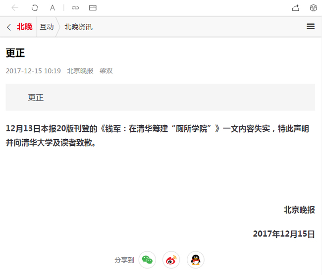 12月13日本报20版刊登的《钱军:在清华筹建“厕所学院”》一文内容失实,特此声明并向清华大学及读者致歉。