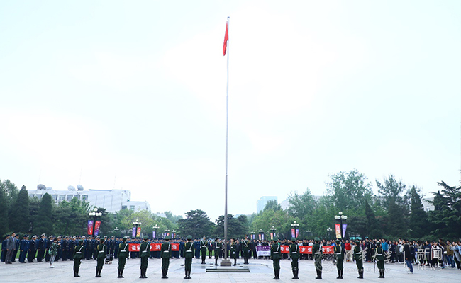 升旗仪式结束后,到场嘉宾与国旗仪仗队部分队员在主楼前合影。