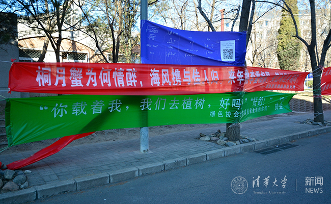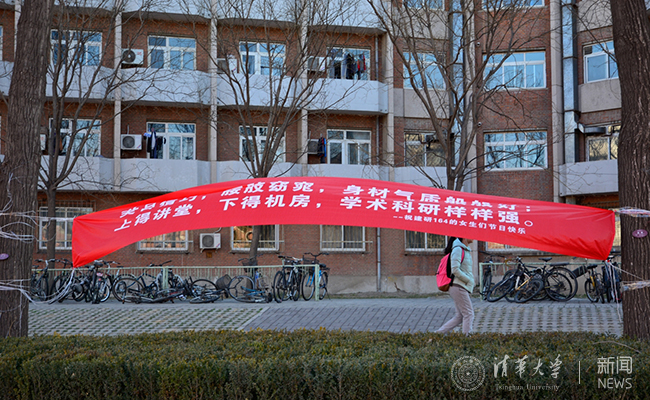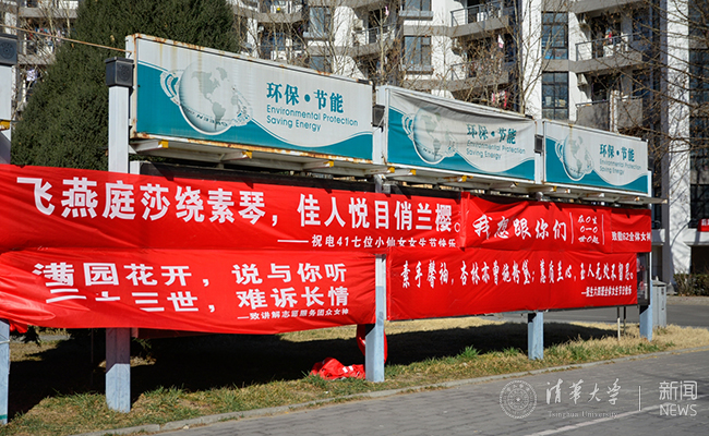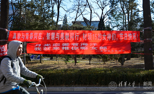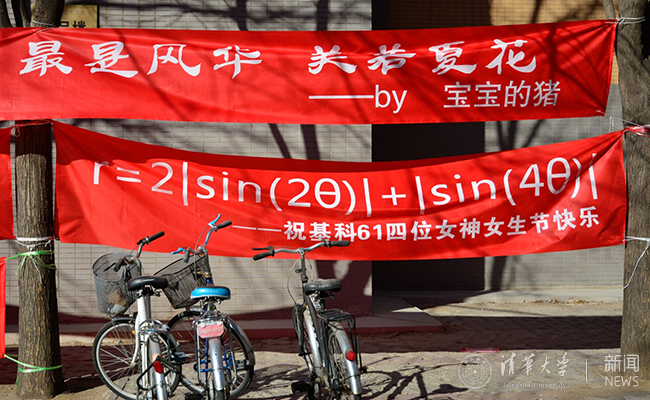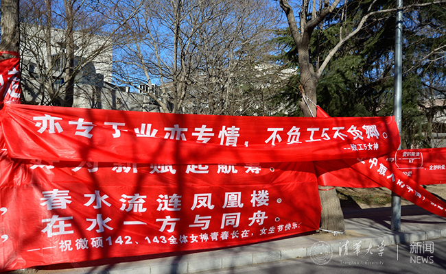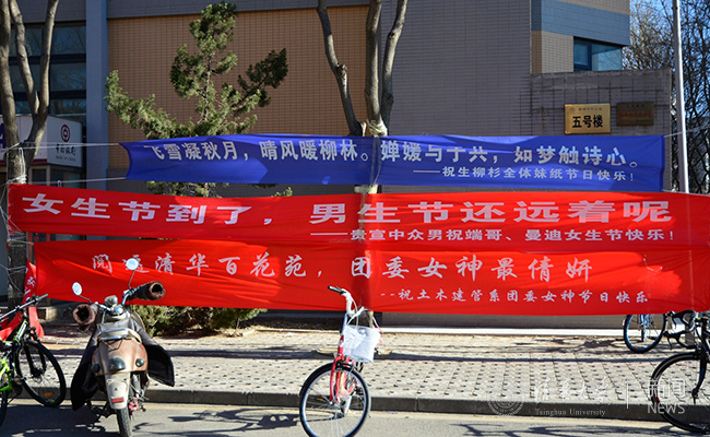 清华新闻网3月7日电 (学生记者 王鹤霖)早春三月,温暖的阳光中仍然透着丝丝寒意。在这样一个万物复苏的季节里,我们又迎来了清华大学的女生节。在这个温馨的节日里,清华大学各院系的同学们开动脑筋,挂出一幅幅独具匠心的横幅,给女生们送上节日的祝福。浪漫和创意是关键,感动和温馨是主题。让这个特别的节日充满了欢乐的色彩。