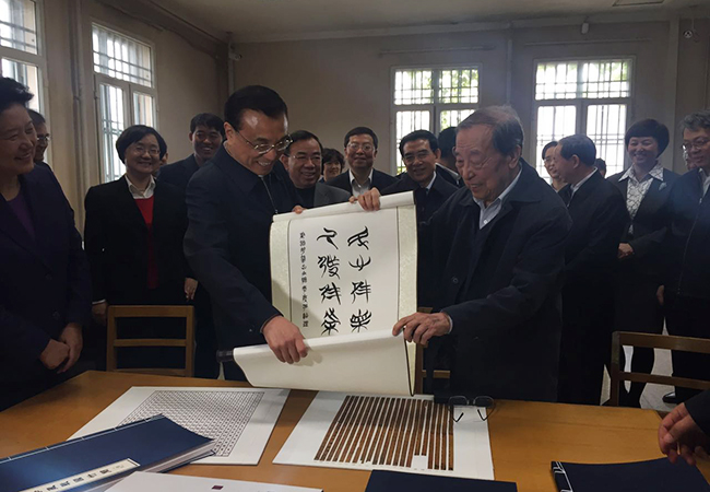 李学勤向李克强赠送《民心惟本,厥作叶》卷轴。