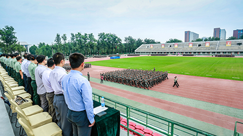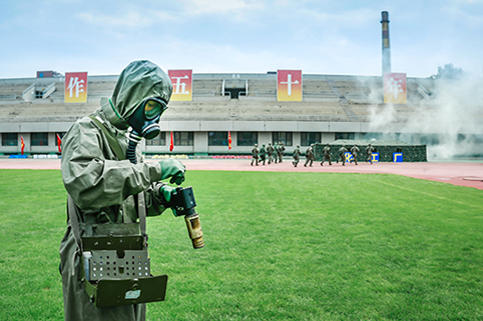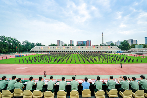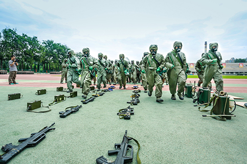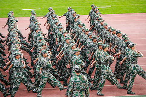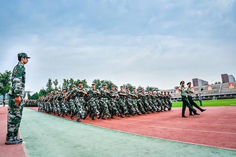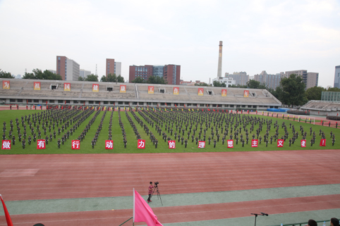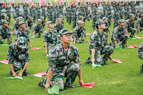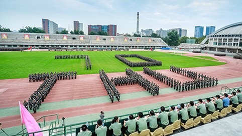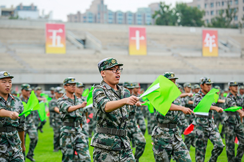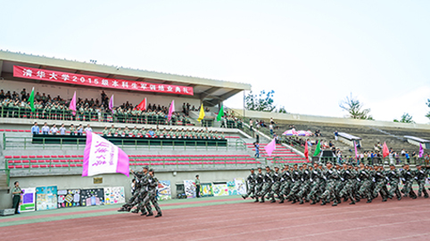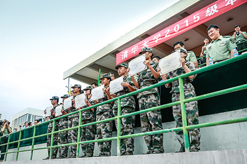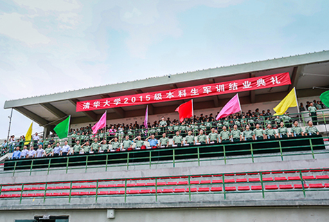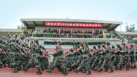 清华新闻网9月11日电(记者 张 宇 摄)9月9日上午,清华大学2015级本科生军训结业典礼在东大操场举行。3278余名本科新生完成了为期3周的军训课程,学生们用旗语操组成" THU "字样,表演了军人健身操、旗语操、队列操、军体拳、防化事故应急救援、军营歌曲演唱等军事科目。