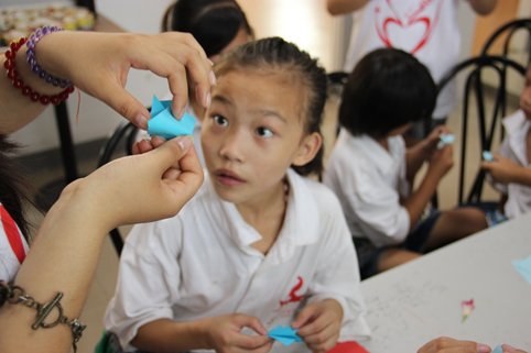 图为孩子们拿着自己的长卷轴创作和赴四川省雅安市地震灾区艺术支援支队的哥哥姐姐合影留念。