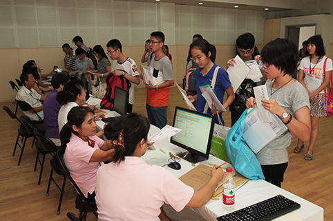 新生在办理报到手续,神情分外专注。记者 郭海军 摄
