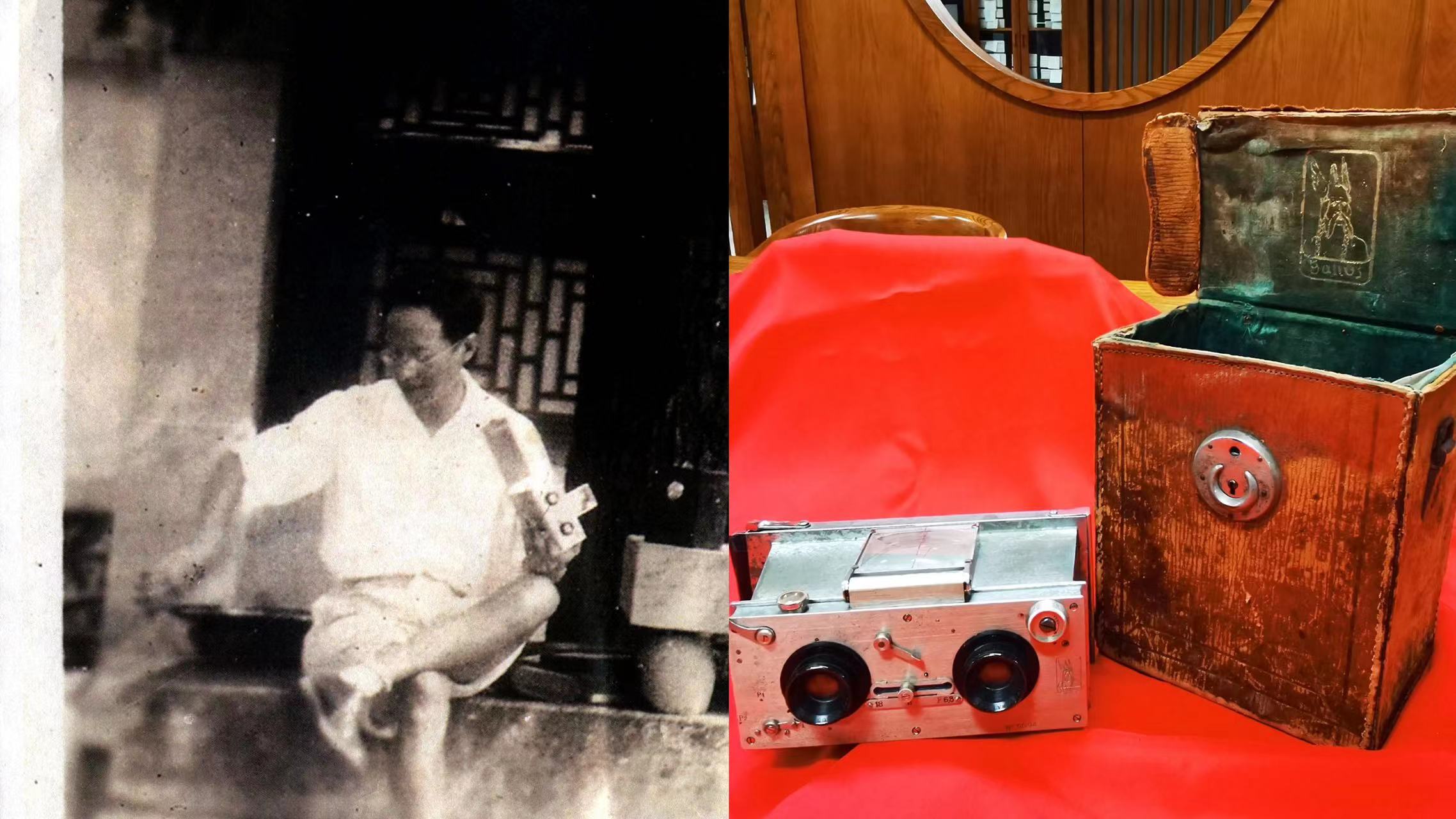 赵元任的第一台相机是他1910年刚上大学时,用奖学金跟同学合伙购买的,从此他便迷上了摄影。此次捐赠的两台相机购置于上世纪20年代赵元任在清华国学院任教期间。其中一台是德国产的皮腔折叠相机,另一台是法国产的双镜头相机。赵元任用它们拍摄了不少双幅的立体照片,历史照片中还有他当时使用这两台相机的场景。